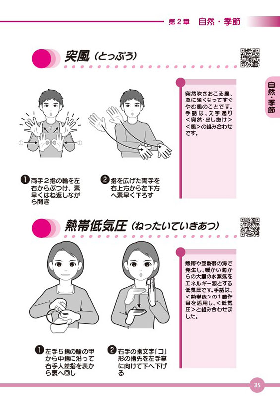 言語・表現、自然・季節、身体・健康、社会、制度・文化など、現在社会で広く使われている用語、全164語を掲載しています。ろう者はもちろん手話初心者から手話通訳者まで必読の一冊です。手話表現を動画で見ることができるQRコードも掲載しています。スマートフォンなどから動きを確認でき、より分かりやすく学べます。